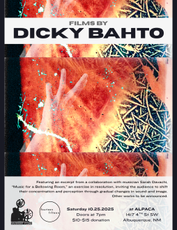 Los Angeles-based artist Dicky Bahto will make his first appearance in Albuquerque, with a program featuring an excerpt from his recent three-hour long collaboration with musician Sarah Davachi, Music for a Bellowing Room, an exercise in resolution, inviting the audience to shift their concentration and perception through gradual changes in sound and image. The piece was originally commissioned by the Museum of Modern Art in New York, and received its premiere performance in September 2023. (note that this will be a different excerpt from the one he is showing in Santa Fe on October 17th). Other works to be announced.